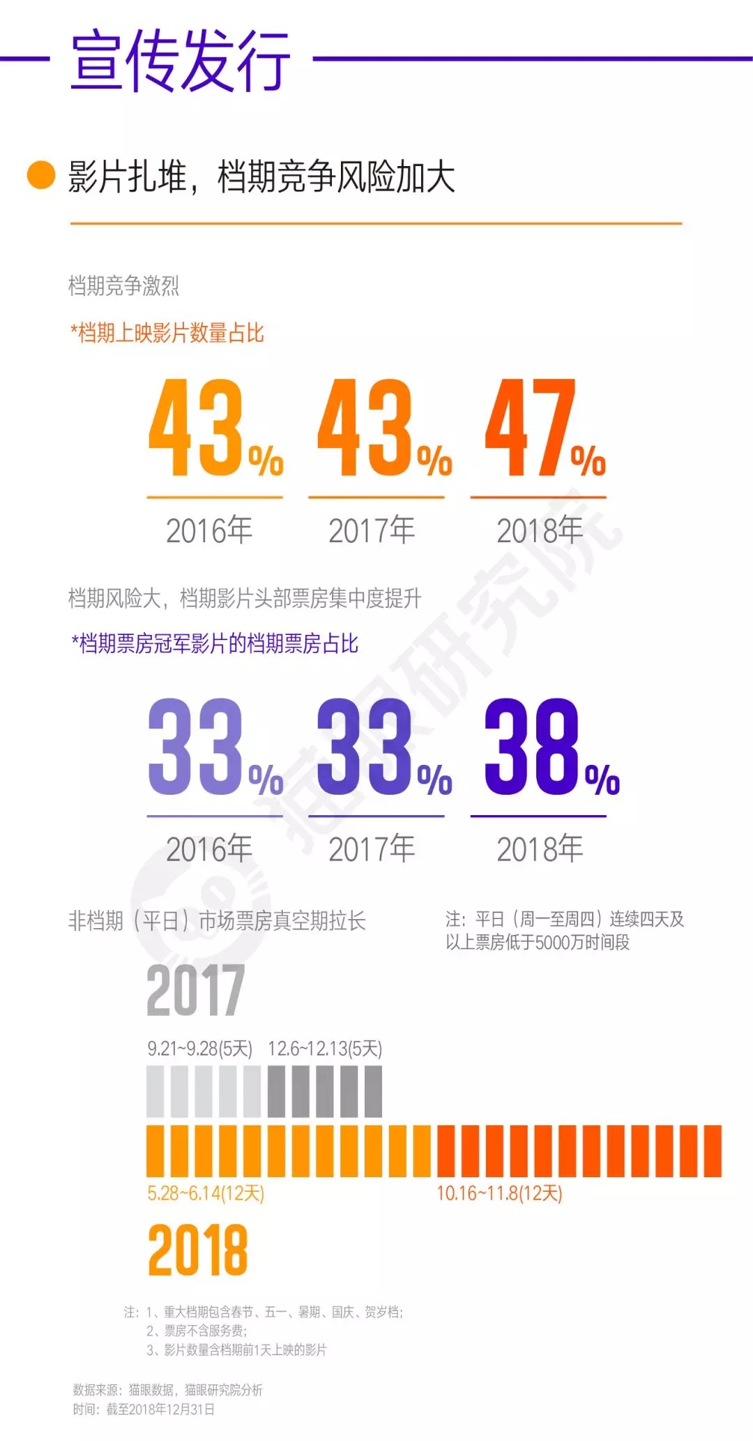 从电影档期来看,2018年影片扎堆上映的现象更明显,猫眼数据显示2018年档期上映影片数量占比达47%,这一数据超过了2016、2017年;档期票房集中程度却在进一步提升,档期票房冠军影片票房占比也达38%,比前两年增长了5个百分点。这意味着电影市场档期竞争风险进一步加大。