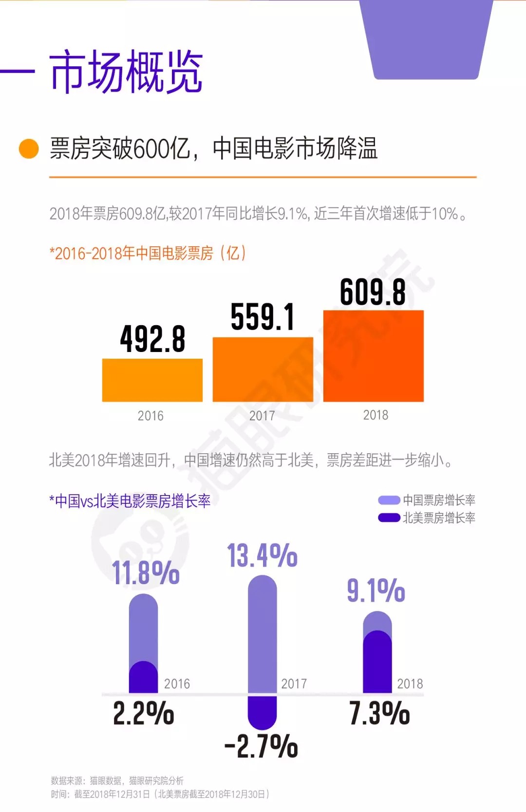 2018年度总票房成功突破600亿,电影产业年度“小目标”达到,刷新了中国影史年度总票房的新纪录,市场进入600亿新纪元。但耀眼的记录之下却隐藏着“降温”的信号:今年票房市场增速是近三年来增速首次低于两位数。但值得一提的是,中国的票房增速虽呈现下降状态,但增幅仍远高于北美市场,这意味着国内与北美市场的差距进一步缩小。