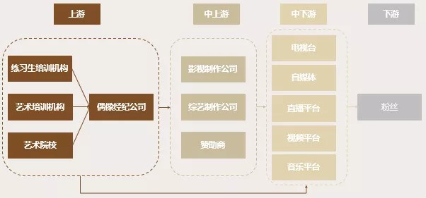 偶像经济产业链可分为上游偶像供给端,包括偶像经纪公司和各类艺术培训机构;中游偶像曝光平台,包括音乐作品、网综、网大等;下游粉丝端,包括粉丝社区、粉丝工具等。