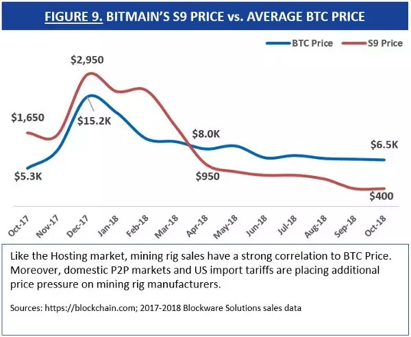 △图9:与托管市场相同,矿机售价和比特币的价格也呈正相关。二手市场与美国的进口关税也给矿机厂商在定价时带来了额外压力。