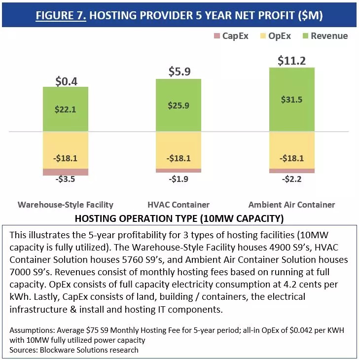 △图7:3种托管设施在5年内的净利润。仓库式数据中心可以容纳4900台S9,暖通集装箱方案(HVAC)可容纳5760台S9。Ambient Air集装箱方案可容纳7000台s9。每个方案的营收(Revenue)包括每月托管费用,运营成本(OpEx)包括按4.2美分/千瓦时计算的所有电力成本。最后,资金支出(CapEx)包括土地、建筑/集装箱、电力基础设施、安装费及托管IT组件。
