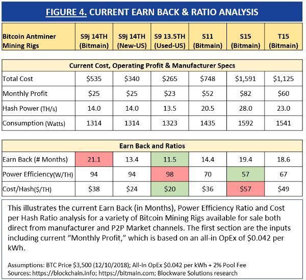 △图4:当前的回本期分析。该图表对比了目前不同渠道矿机(从厂商购买的新机和二手市场购买的二手矿机)的每月收益、能效比,及每哈希比的成本。第一部分为投入的费用,按每千瓦时0.042美元进行计算,其中包括每月收益。