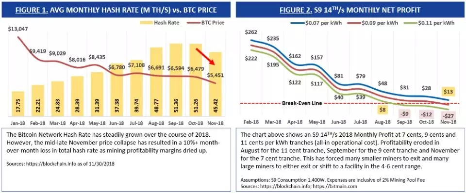 △图1:每月平均哈希率(M/S)与BTC价格对比。比特币网络的哈希率在2018年稳步增长。然而,11月中下旬比特币价格暴跌导致挖矿利润收缩,最终造成每月总哈希率环比减少10%以上