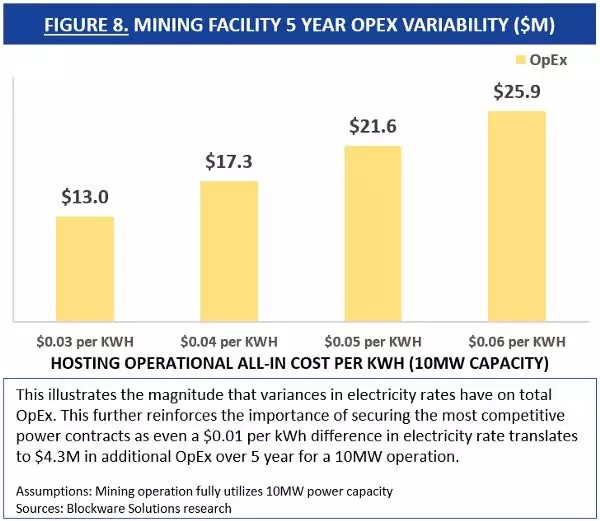 △图8:矿机5年的运营成本。该图表说明电价变化对总运营成本的影响,进一步表明签订低价电力合同的重要性。因为即使是0.01美元/千瓦时的电价差异,在未来5年多的时间里,也会产生430万美元的额外运营成本。