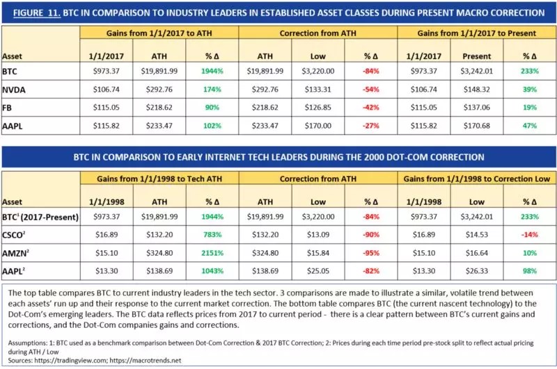 为了说明宏观经济调整周期的背景,有必要将当前的比特币价格走势与2002年“互联网泡沫”中幸存的互联网优质股进行比较。[图11]。从宏观调整的角度来看,比特币正如之前的亚马逊(AMZN)、思科(CSCO)和苹果(AAPL),正处在发展周期中的早期成长阶段。