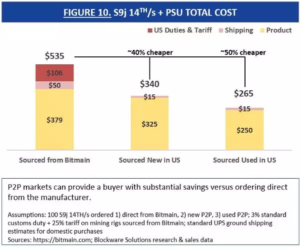 △图10:不同渠道和类型的S9矿机的总成本对比。在二手市场购买矿机,可以节省大量成本,相当于以出厂价购买矿机。假设订购100台S9矿机,柱1为直接从比特大陆购买新款矿机的费用;柱2为在美国市场购买新款矿机的费用;柱3为在美国二手市场购买二手矿机的费用。从比特大陆购买需要支付3%标准关税+25%矿机关税,美国本土购买假设为标准UPS物流费用。
