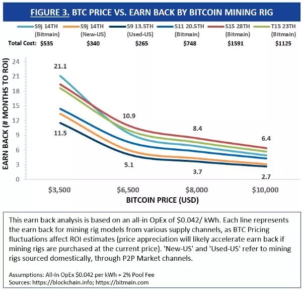 △图3:比特币价格对比挖矿回本周期。该图的盈利分析基于0.042美元/千瓦时的运营成本所推算。由于BTC价格波动会影响矿机的投入产出比,因此图表中使用不同的线段代表不同渠道和类型的矿机的收入。Bitmain代表直接从比特大陆购买的新款矿机,New-US代表在美国本土购买的新款矿机,Used-US代表在美国二手市场购买的二手矿机。