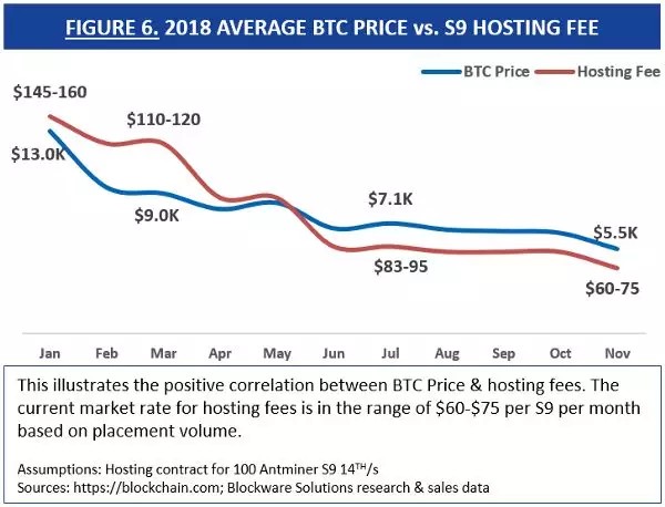 △图6:2018年比特币均价对比S9矿机的托管费用。该图表说明,比特币价格与矿机的托管费用呈正相关。目前每台S9矿机的托管费用为60~75美元/月。