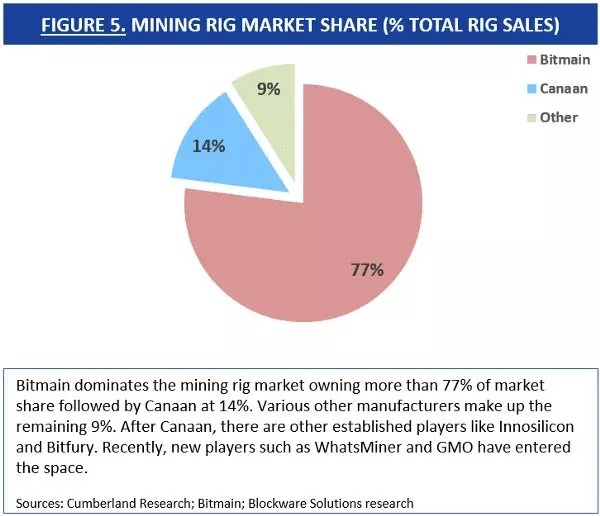 △图5:矿机市场份额。比特大陆的矿机在市场中占主导地位,市场份额为77%;嘉楠耘智的矿机市场份额为14%;剩下9%的市场份额由其他生厂商共有。除嘉楠耘智,矿机市场还有Innosilicon、Bitfury等老牌玩家,以及WhatsMiner、GMO等刚进矿机市场的新玩家。
