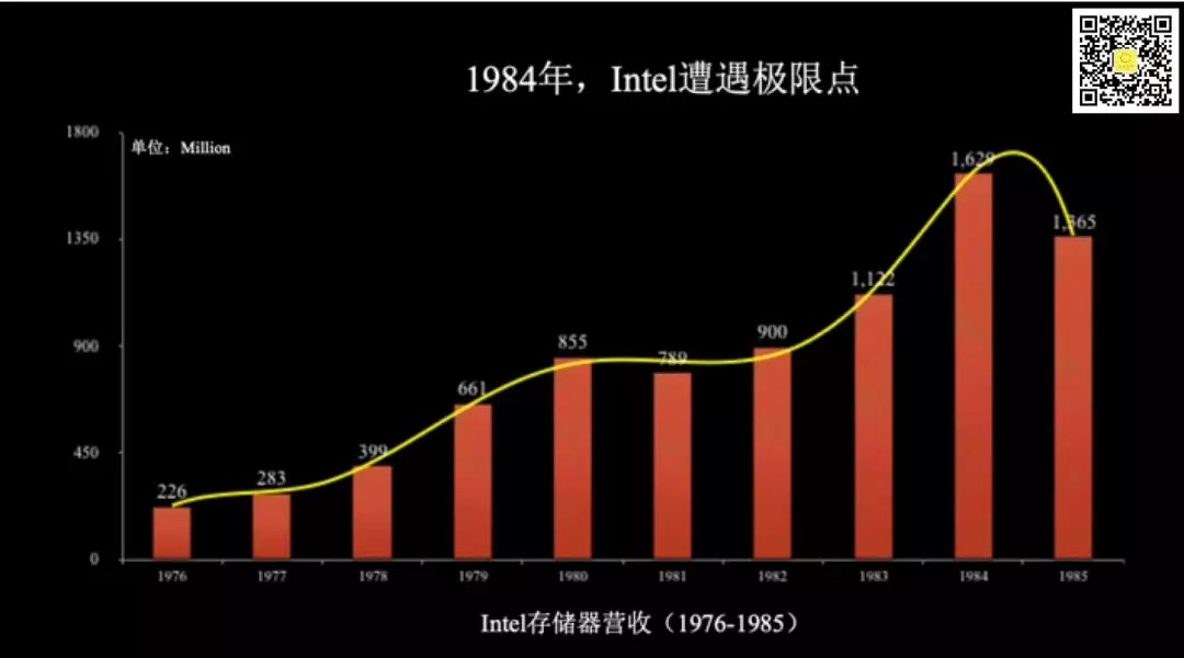 举个例子,英特尔历史上曾遭遇一次至暗时刻。英特尔是最早的存储器发明者,存储器当时占整个计算机成本的60%。在这么肥的一个市场,英特尔占据了100%的市场占有率。