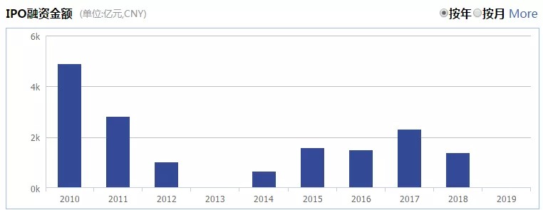上图可以看出,2018年,公司通过IPO筹集的资金仅仅高于2012年与2014年,只有1378亿元。