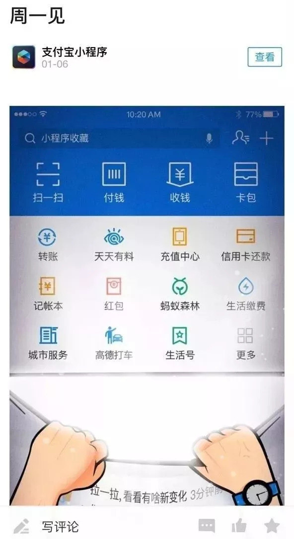 1月6日,支付宝小程序官方生活号曝光了一张异形的支付宝主UI界面,着重突出了支付宝首页的中间位置,并采用了双手下拉的动画示意进行强暗示,极有可能与支付宝小程序相关。