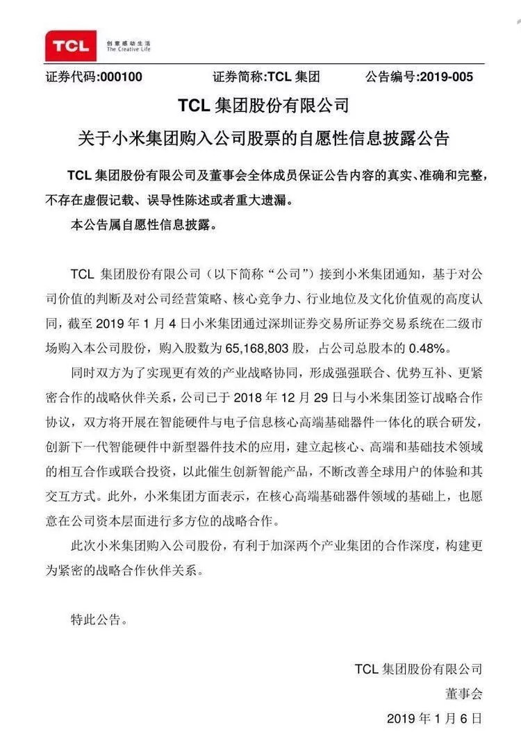 1月6日下午,TCL集团发布公告,宣布小米集团战略入股TCL集团。公告显示,2019年1月4日小米集团通过深交所在二级市场购入65,168,803股,占公司总股本的0.48%。TCL表示,此次入股有利于加深小米和TCL两个产业集团的合作深度,构建更为紧密的战略合作伙伴关系。此前,2018年12月29日TCL集团就与小米集团签订了战略合作协议,双方将开展在智能硬件与电子信息核心高端基础器件一体化的联合研发。
