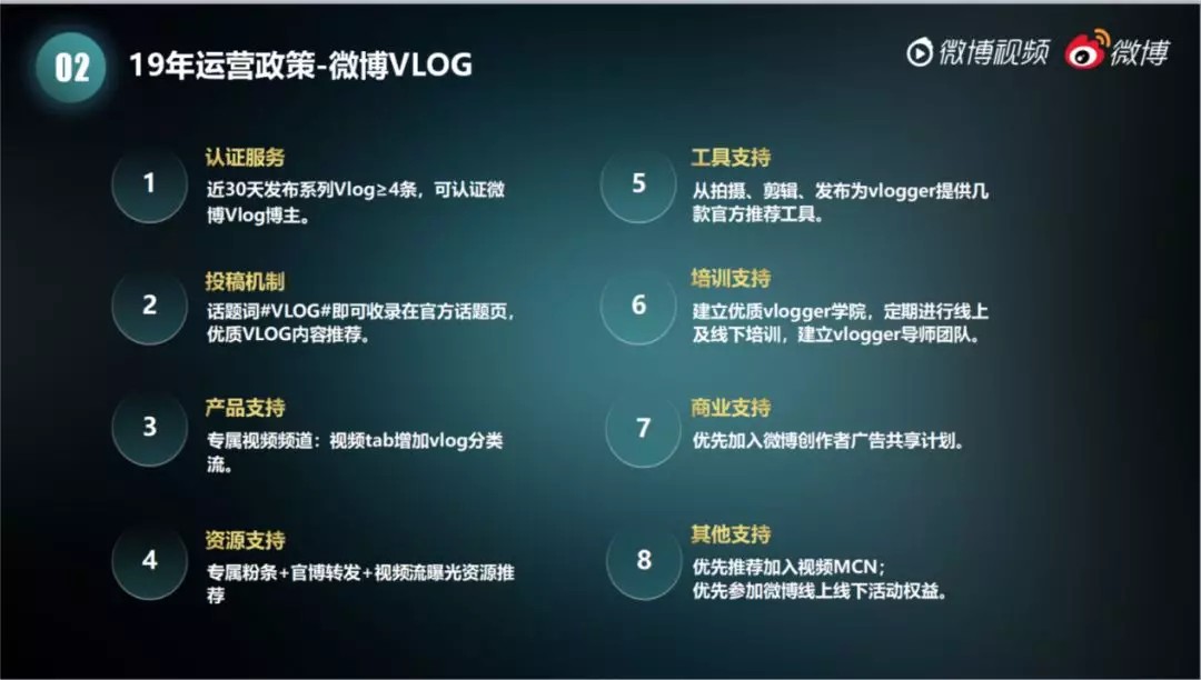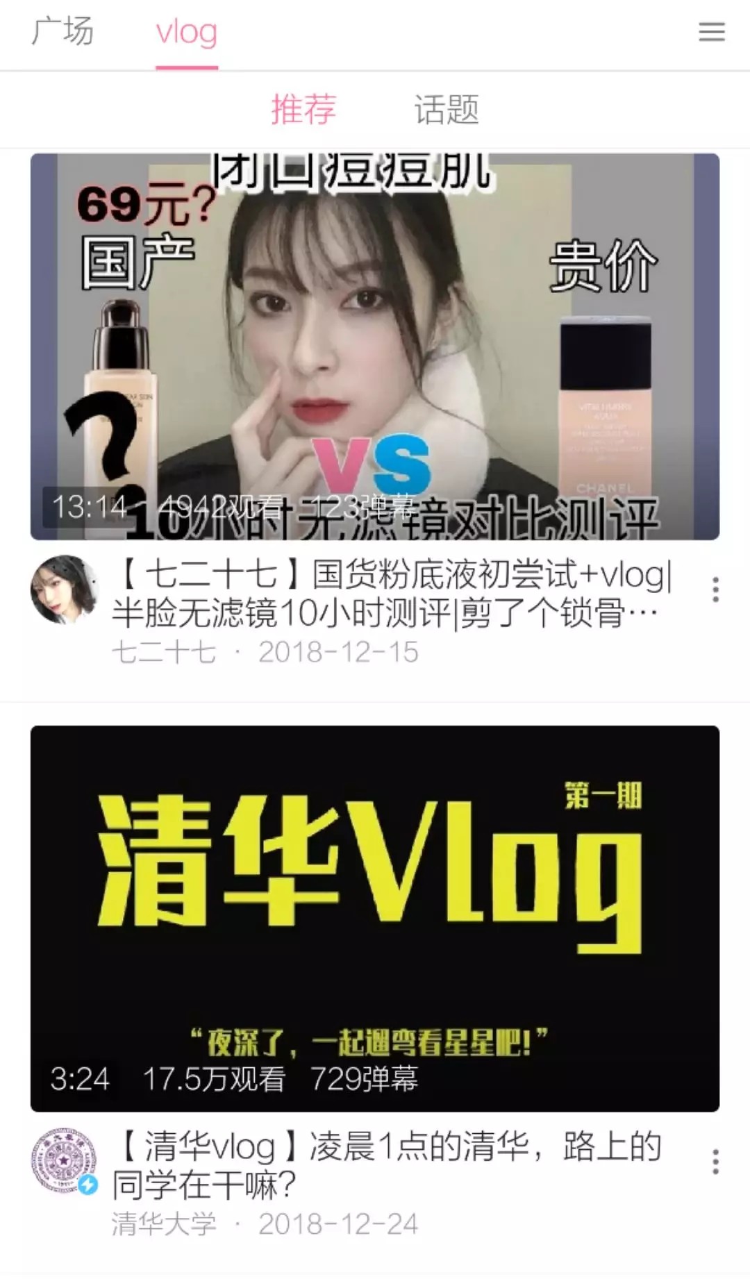 先是B站在首页上发起了30天Vlog挑战,并在频道页给了Vlog一个和“广场”版块并立的单独分区,这个位置显然已经说明了B站的态度;随后微博“V影响力峰会”上继续加码,宣布在2019年的视频扶持策略中,要给Vlog工具、培训、流量、商业化等多方面的扶持。