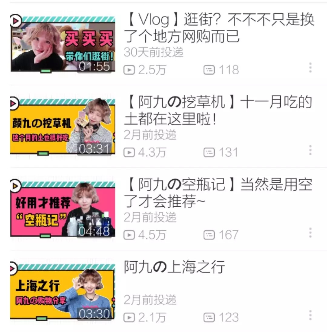 这种不了解,就导致了国内虽然也有一些博主尝试了Vlog,但是效果并不理想,比如知名美妆博主认真少女颜九在B站上的Vlog内容,就远低于她所发的美妆视频播放量。