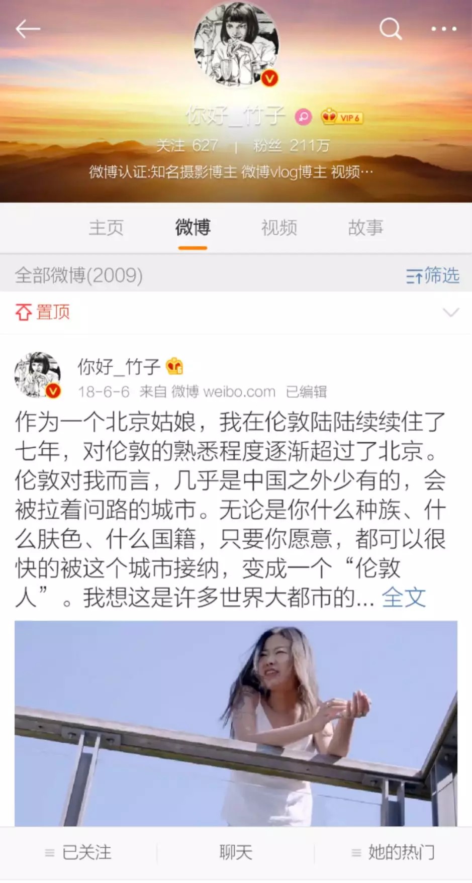 半个月前,就在一年一度的微博“V影响力峰会”论坛上,拥有200万微博粉丝的竹子,在众多行业媒体,以及互联网圈大佬面前做了一场名为“一个Vlogger的成长史”的演讲。