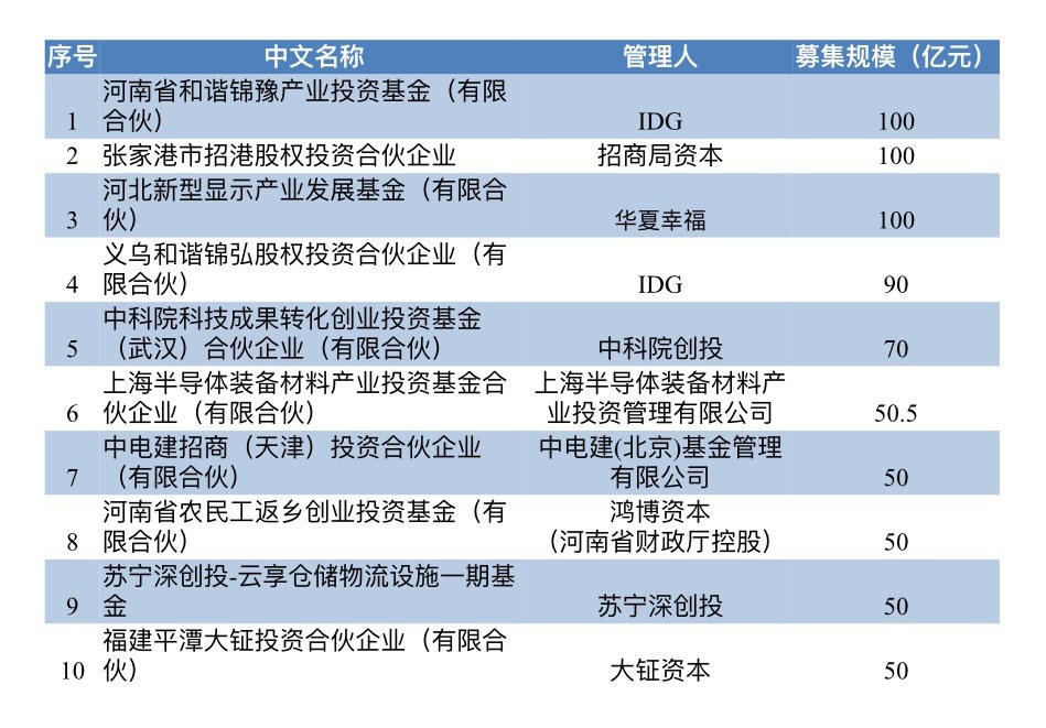 除了财政直接出资外,包括央企、城投公司在内的国有企业也非常活跃。以上十只基金中有6只基金,国有属性的资金占到了总基金规模的一半以上。总规模50.5亿元的上海半导体装备材料产业投资基金合伙企业(有限合伙),集齐了PE国家队、地方城投公司、国有控股上市公司,100%的资金为国资属性。