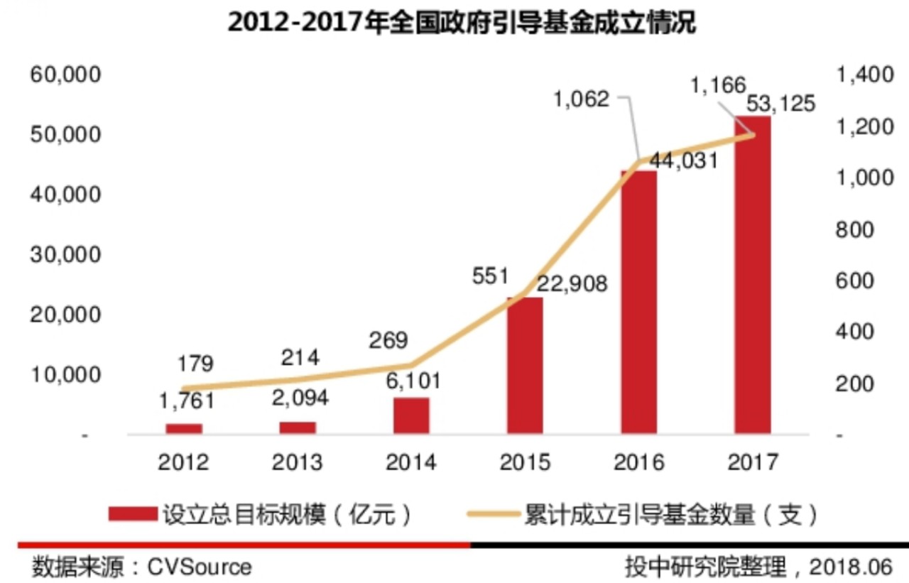 根据投中研究院发布的《2018年政府引导基金专题研究报告》,截至2018年6月底,国内共成立了1171只政府引导基金,总规模在1.4万亿元至1.8万亿元之间。若包括子基金在内,总目标规模近6万亿元。