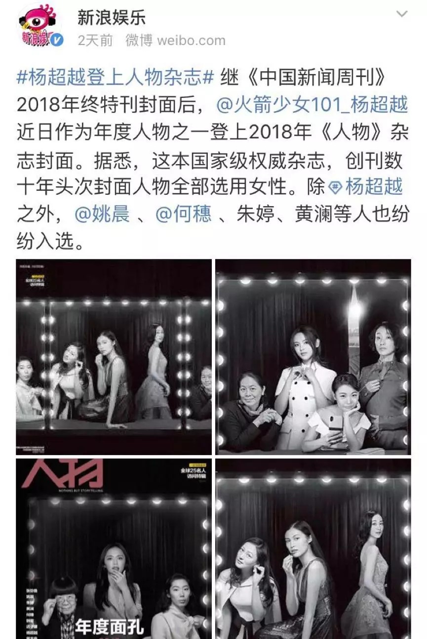 2019年初始,世界伸出手抓住了流量最后的尾巴:杨超越登上《人物》杂志封面,与女排队长朱婷、超模何穗、演员姚晨、作家蒋方舟等九位女性一起,成为《人物》“2018年度面孔”。