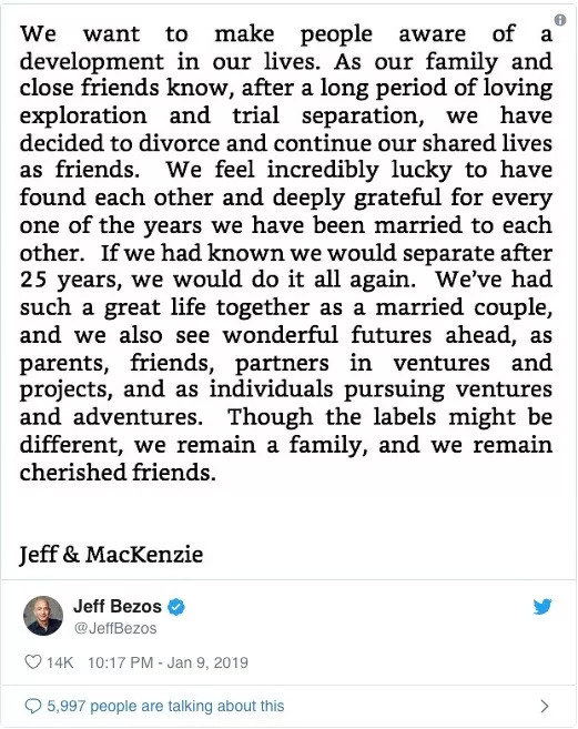 目前为止,种种迹象显示,贝佐斯夫妇是和平分手,在财产分割上会进行友好协商。