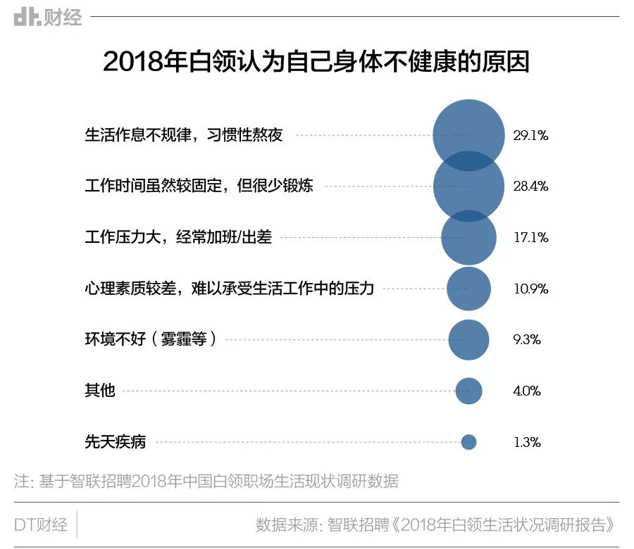 智联招聘针对白领的调研结果显示,29.1%的白领觉得自己生活不规律、习惯性熬夜是不健康的原因,还有不少人认为主要是因为缺少锻炼、工作压力大。