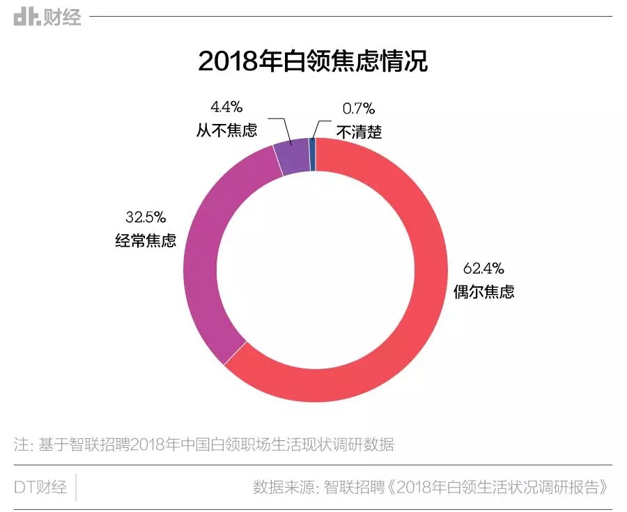 另一方面,当代年轻人的焦虑程度也超乎想象。在同一个调研中,接近95%的白领存在不同程度的焦虑问题。