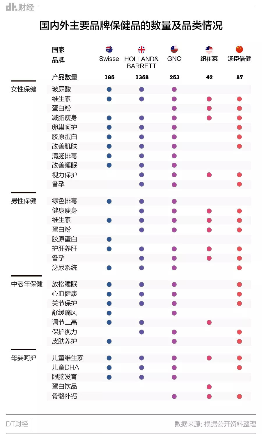 我们把国内外几个主要的保健品牌拉出来进行对比。