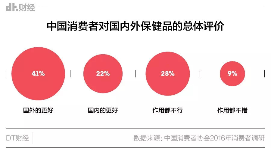 中青年这里,有更广阔的保健市场。只是,他们对“什么样的保健品更好”这个问题有着自认为更加科学的判断,于是对不同领域的保健品展现出截然相反的态度。在中国消费者协会2016年的调研中,41%的被调研者认为国外的保健品更好,22%的被调研者则相反。