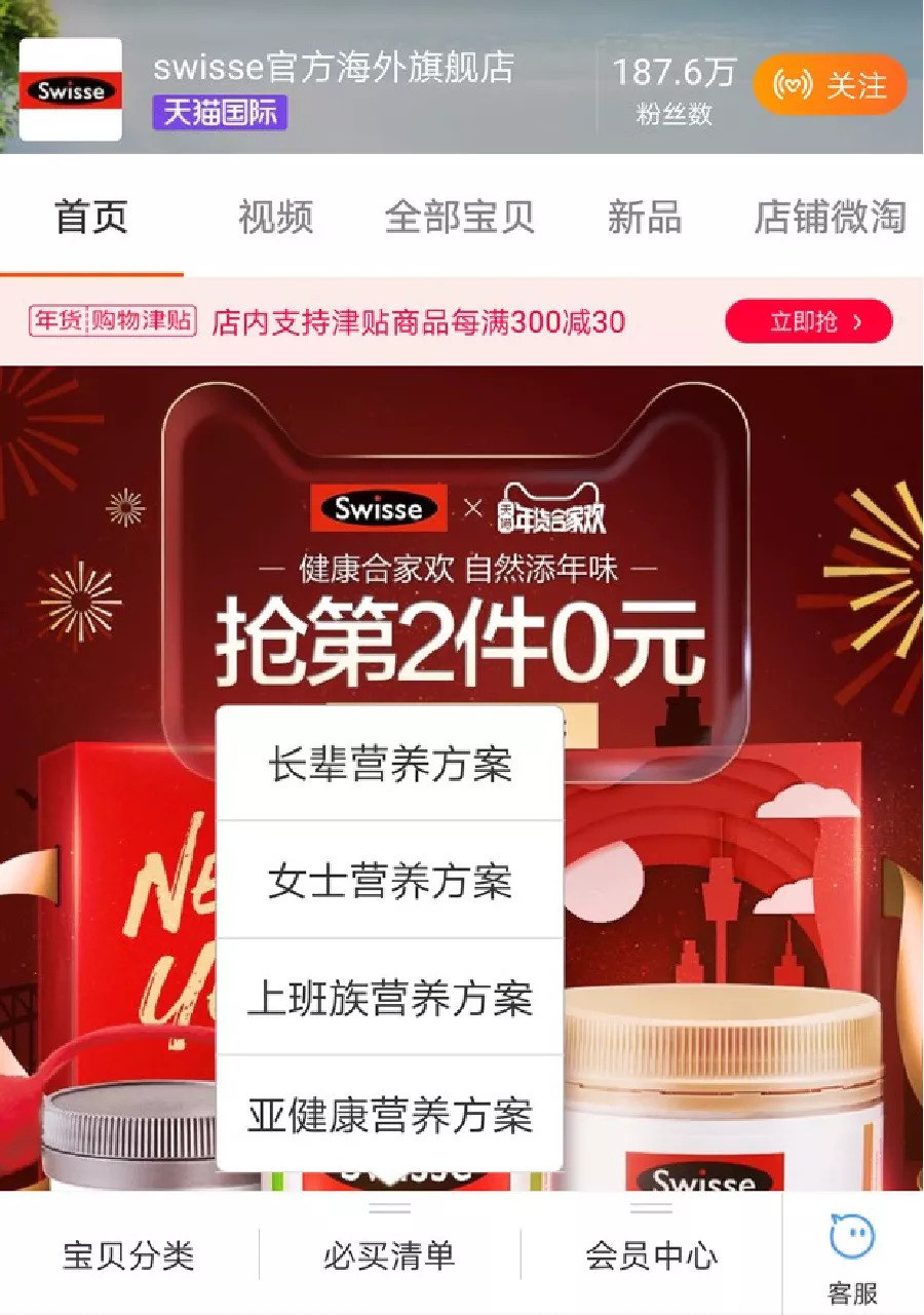 保健品牌方很清楚他们的消费者是谁,Swisse官方旗舰店首页分别针对长辈、女士、上班族和亚健康人士,提供了必买清单的建议。
