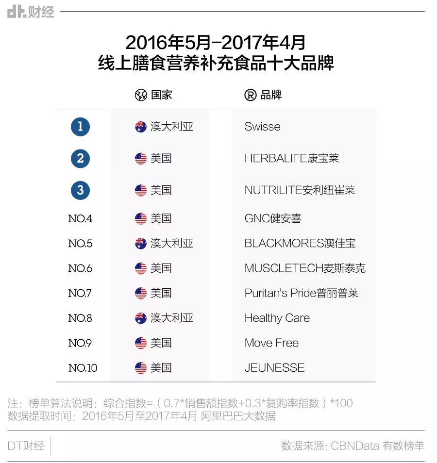 这个倾向占比在中青年人群中可能会更悬殊。综合考量销售额和复购率,2017年线上膳食营养补充食品十大品牌,全部来自海外。