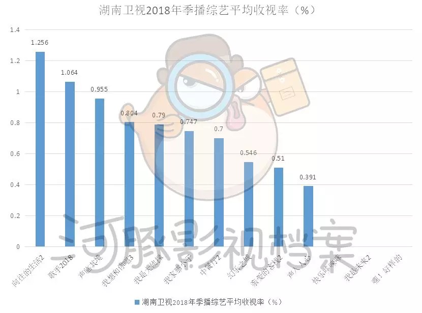 以号称最懂年轻观众心理的湖南卫视为例,2018年拿的出手的成绩寥寥无几,收视第一的《谈判官》仅1.192,《老男孩》勉强过1,其余都未过1。