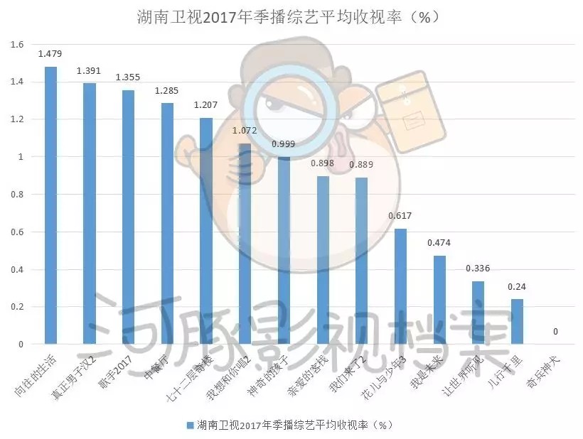 2017年湖南卫视有6档平均收视破1的季播综艺,以《向往的生活》为代表的慢综艺成为湖南卫视的救命稻草。