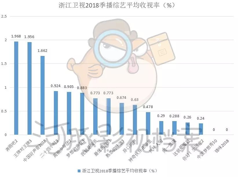 大约浙江卫视把所有心思都放在综艺节目的铺排上了。浙江卫视“偏科”现象由来已久,随着以《中国好声音》、“跑男”为代表的综艺节目的爆红,浙江卫视开启综艺立台之路。事实上,2018年其在综艺方面的成绩确实超越其他四大卫视,但剧集的表现差强人意也是有目共睹。