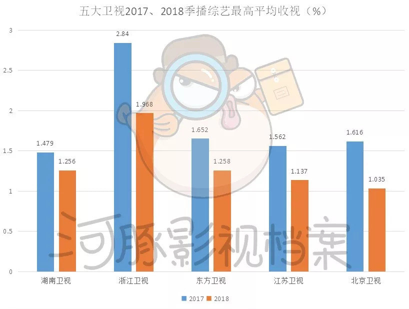 大趋势不可逆,五大卫视2018年季播综艺收视率也迎来大幅缩水。最高平均收视率从2.8跌至1.9,平均收视破2 的综艺节目不复存在,那些动辄最高收视破3、破4的高光时刻早已不可追。