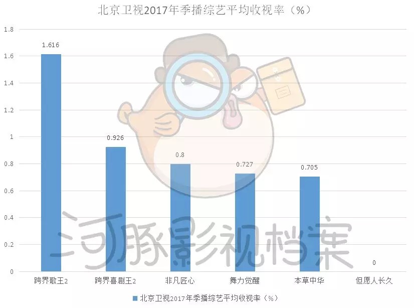 但北京卫视无疑是五大卫视中收视最为平稳的一家,除《跨界歌王》系列下滑了0.5,《跨界喜剧王》《非凡匠心》等节目的收视率几乎与前年无疑,受众忠诚度极高。