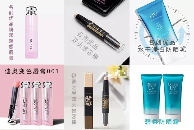 除了在各渠道大力推广外,名创优品在大量产品上效仿知名品牌设计,比如迪奥变色唇膏、碧柔防晒霜等,以 “平价代替”的标语堂而皇之地出现各社交平台KOL的更新中。蹭着大牌的热度,名创炒出了一个又一个爆款。