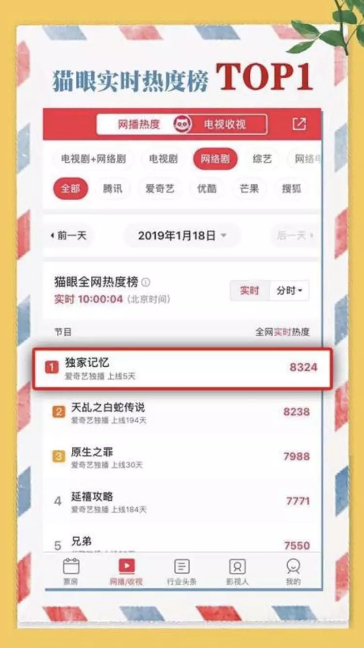 2016年《最好的我们》在爱奇艺首播,2018年登陆卫视平台,成功实现台网反输,口碑和热度不减,并在两年时间里持续发酵,充分证明了爱奇艺对青春剧集的打造能力,令主要聚焦在个人青春成长的青春校园题材展现出强大市场潜力;2017年《你好,旧时光》除了收获不俗成绩外,打造全景式青春,从视角层面、感情层面、时间跨度层面等多维度勾勒出集体式的青春群像,示范了青春剧的全新打开方式;2018年《教室的那一间》打造国内第一部真正属于90后的暖心青春校园剧,真实展现时代校园生活,引起90后用户的集体共鸣;2019年《独家记忆》,凭借对原著的创新改编和主要人物成长主线的刻画,使剧集更加真实,更具代入感。根据猫眼数据显示,《独家记忆》实时热度最高达到8324,位居网络剧热度榜头名。