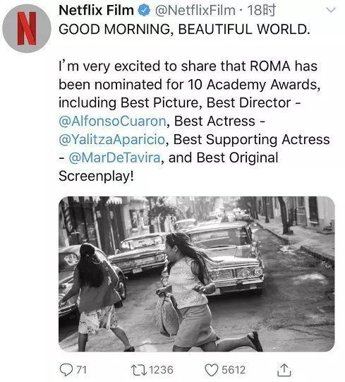 Netflix获15项奥斯卡提名,《罗马》提名最佳影片