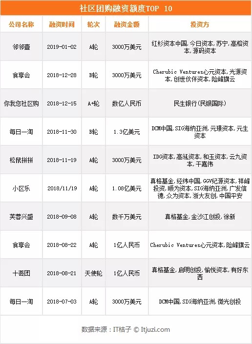 众多知名机构相继入场,真格基金、高榕资本、SIG 以及红杉资本等都选择大手笔押注,2018 年 IT 桔子监测到的近 20 家典型社区团购平台,平均每家获投额度甚至达到了近 1.5 亿元。