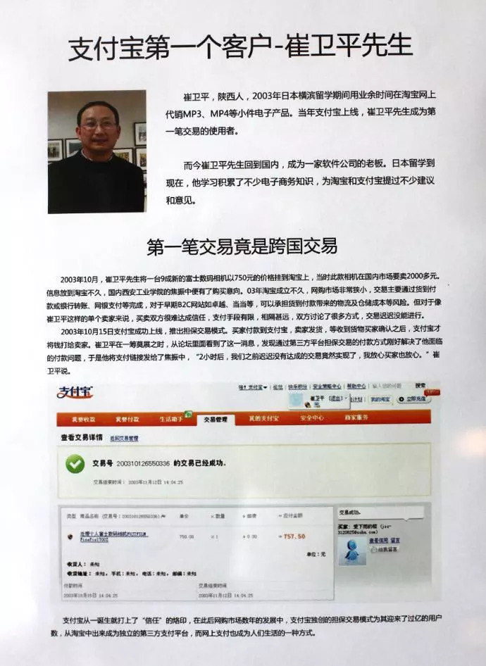 在这个大楼一层的一面墙壁上还留着支付宝历史上的第一笔订单的记录。2003年10月,在日本横滨留学的崔卫平通过淘宝新推出的第三方担保交易平台支付宝将一台九成新的富士数码相机,以750元的价格卖给西安工业大学的焦振中。