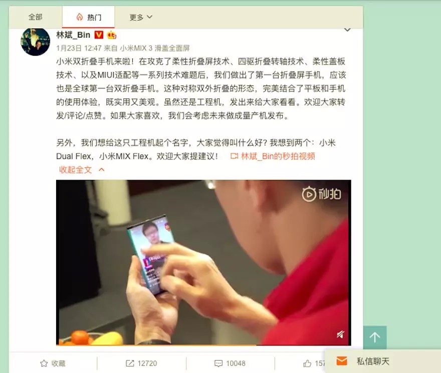 近日,小米总裁林斌在微博上发文并上传了一段视频宣布,“小米双折叠手机来啦!在攻克了柔性折叠屏技术、四驱折叠转轴技术、柔性盖板技术、以及MIUI适配等一系列技术难题后,我们做出了第一台折叠屏手机,应该也是全球第一台双折叠手机。”