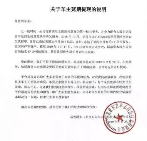 1月25日,易到用车再次推迟提现时间至2019年2月22日,称目前正全力配合大股东韬蕴资本追回乐视及贾跃亭所欠债务。截止1月17日,法庭判令正式生效,韬蕴将在近期启动拍卖FF公司的股权,获得款项将优先用于易到车主提现。