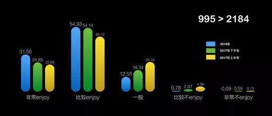 2017年底我们900多人,2018年底我们2200人。最近一次2018年的调查收到了1800多个匿名问卷,整体来讲感觉自己enjoy的人比例在增加,认为自己不够enjoy的人比例在降低。反复核对了这个数据,发现突然人多了我们居然做的更好了一点点,很欣慰。但,因为人翻了一倍,实际上还是有很多人不够enjoy。