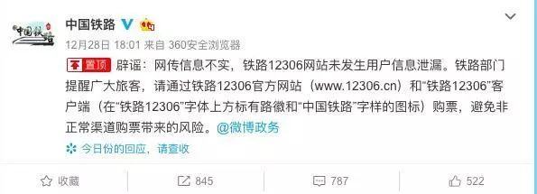 此外,还包括每个账户中添加的联系人信息,涉及姓名及身份证号,这些联系人数据总量高达410万。中国铁路微博当日辟谣称12306网站未发生用户信息泄露,同时再次提醒用户避免非正常渠道购票带来的风险。