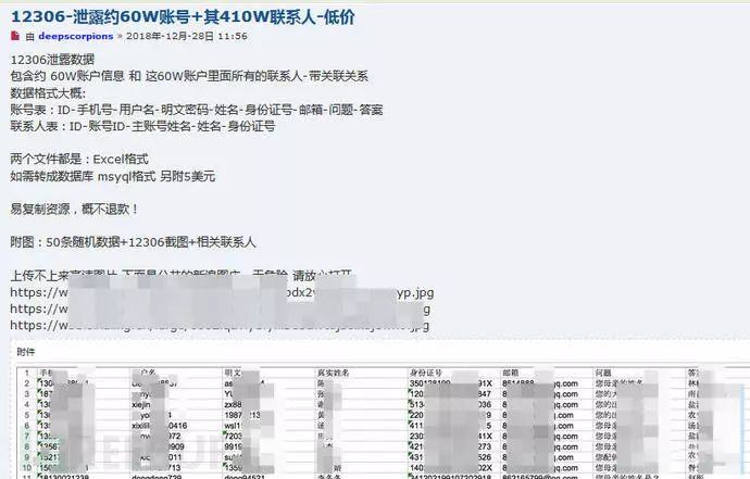 在利益的驱使下,信息泄露的问题并没有好转的迹象。2018年12 月 28 日,Freebuf 称,“圈内又在传一张疑似12306泄露数据暗交易的图,春运抢票高峰还没到,黑产分子就已经出手了”。据称,这份数据包括 60 万账户信息,详细到除了ID、手机号、密码之外,连姓名、身份证、邮箱、问题及答案然都有,根据安全问题很可能能够直接申诉获取其它平台账户的重要信息。