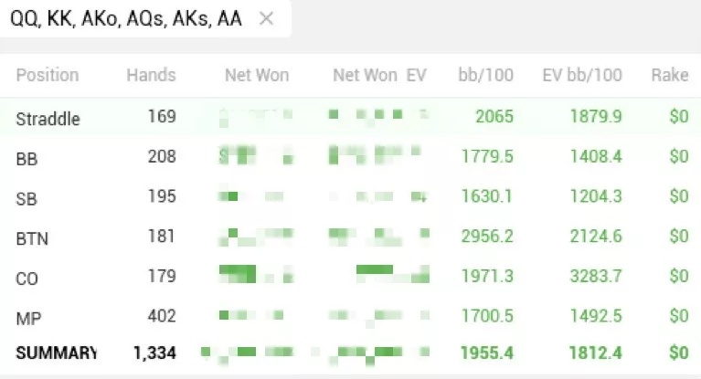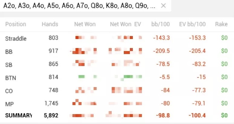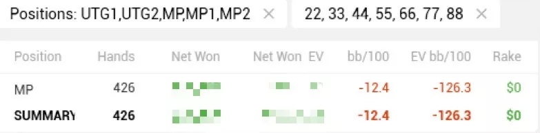 直观的结果是,当我在中间的位置(往往是有选手加注,我选择跟注,同时后面面临其他选手的跟注),在这 400 多手牌里我的数学期望是非常差的。
