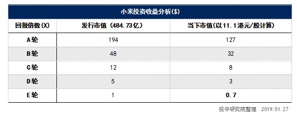 2018年7月9日,小米集团港交所主板上市,发售价格17.00港元/股,共计募集金额总额243.85亿港元。作为港股“同股不同权”创新试点的首家上市公司,小米跃升全球科技股前三大IPO,仅次于阿里巴巴和Facebook。作为早期投资者的晨兴资本的一笔500万美元投资,按照雷军所说,回报倍数达到866倍。按IPO市值484.73亿美元计算,晨兴资本当时500万美元的投资,占已发行股份的8.93%。即使小米股价已经较发行价下滑40%,按当下股价10港元/股计算,这笔投资现在的市场价值也超过30亿美元,回报倍数达600倍。早期投资小米为晨兴高回报提供了足够厚的安全垫。晨兴资本也因此成为2018年VC/PE机构单笔投资回报倍数和总额最高的机构。