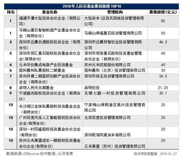 根据CVSource投中数据统计,2018年市场化的VC/PE机构完成募集的最大十支人民币基金如下: