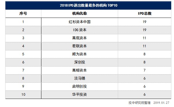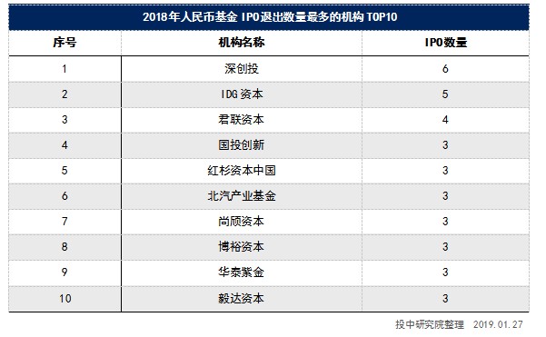 2018年人民币基金IPO退出最多的机构是深创投,但仅有6家,较2017年深创投19家上市有大幅下滑;IDG资本5家、君联资本4家;国投创新、红杉资本中国、北汽产业基金、尚颀资本、博裕资本、华泰紫金和毅达资本分别为3家。