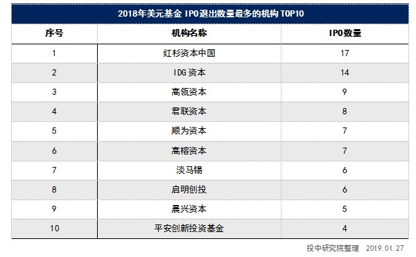 CVSource投中数据显示,2018年共有321家中国企业全球IPO,相比2017年的598家大幅减少,其中A股105家,港股176家,美股及其他40家。2018 年,中国企业港股和美股上市的数量和规模均出现了显著增长。其中,赴港上市创出历史新高,也稳居全球资本市场本年IPO占比第一的位置,美股较去年也有所增加。从企业数量上来讲,2018年IPO退出最多的机构分别是红杉资本中国基金和IDG资本,都是19家。其中,红杉资本中国投资企业药明康德A+H股两地上市。